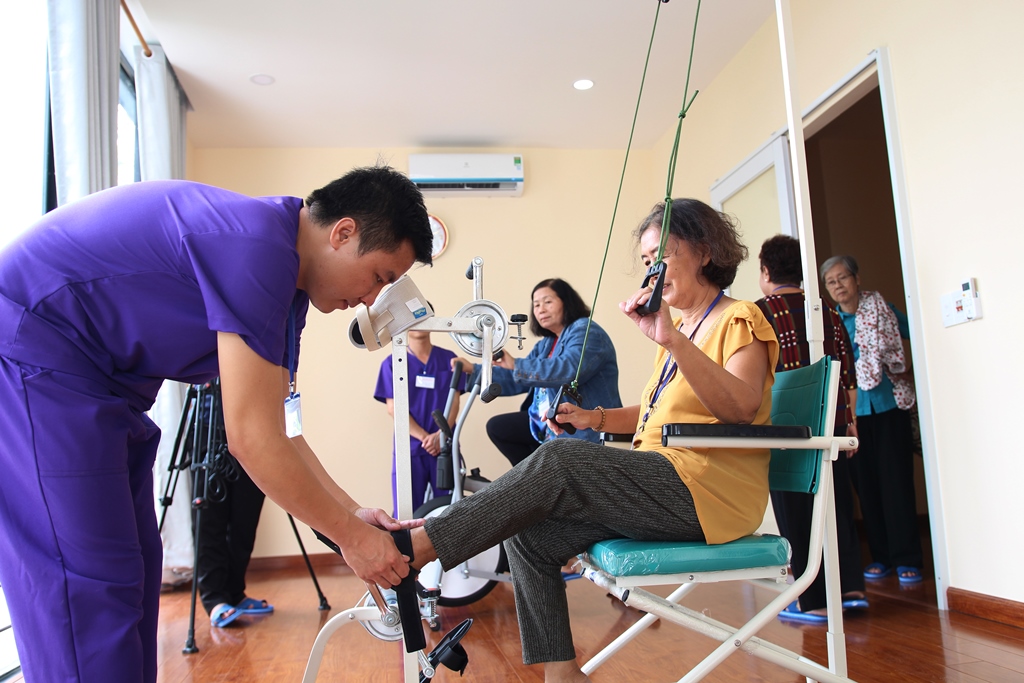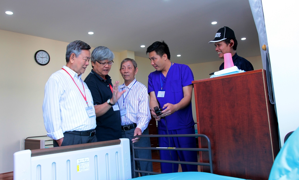 Điều dưỡng của trung tâm đang giới thiệu về chiếc giường đặc biệt, được đặt thiết kế như của các trung tâm dưỡng lão ở châu Âu và Nhật Bản. Mọi người rất thích thú vì chiếc giường có thể nâng lên, hạ xuống tùy theo ý thích của người sử dụng).